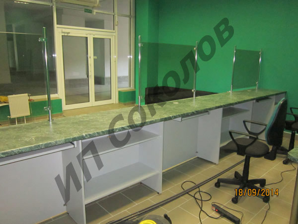 Линейный ресепшн дополнен тремя стеклянными перегородками. Ударопрочная столешница, выполненная в зеленом цвете, имитирует мрамор.