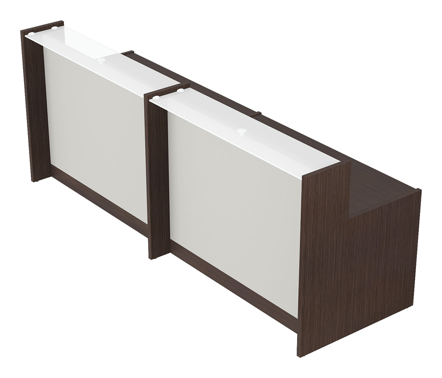 Стойка администратора рассчитана на два рабочих места. Оптимальная высота не позволяет видеть посетителям экран компьютера и действия офисного работника. Конструкция выполнена в сочетании цветов венге и белого.