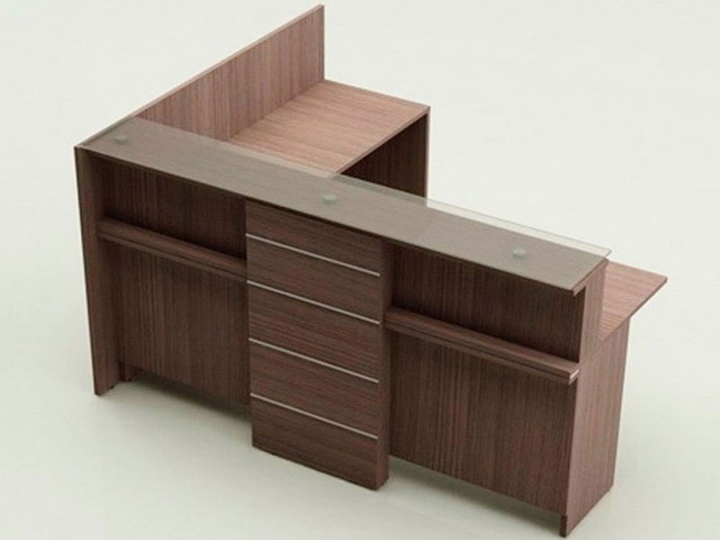 Стойка администратора имеет угловую конструкцию, сверху ее находится горизонтальная панель из стекла. Модель характеризуется высокой прочностью и долговечностью. Материалом изготовления служит ЛДСП цвета орех. Установка данной конструкции поможет привлечь в компанию больше клиентов, а также повысить статус и улучшить имидж среди партнеров и инвесторов. Для сотрудника за стойкой обеспечивается комфортное рабочее место.