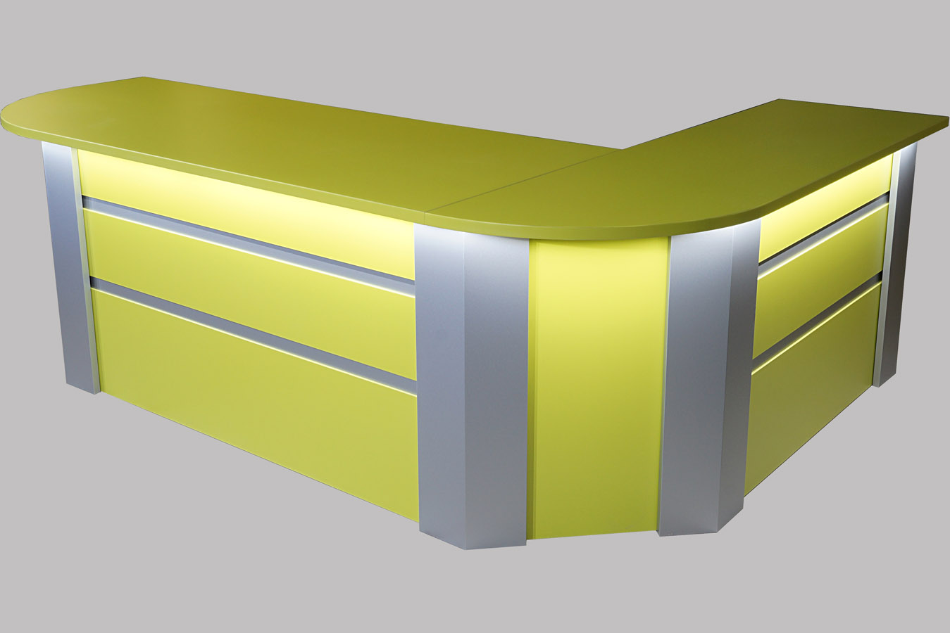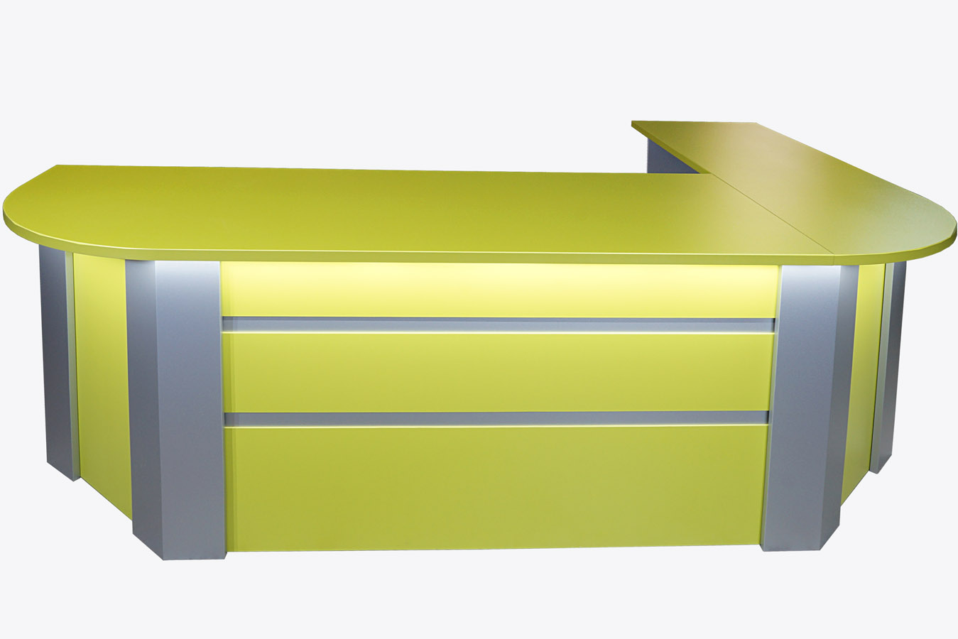 Стойка «Ресепшен эконом» - модель, выполненная в угловой форме. Угол изделия имеет радиусный переход. Фасад представлен в сочетании двух цветов: салатовом и сером.