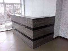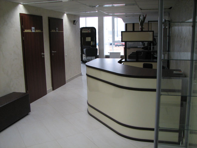Закругленная стойка-ресепшн. Внутренние и подвесные полки.