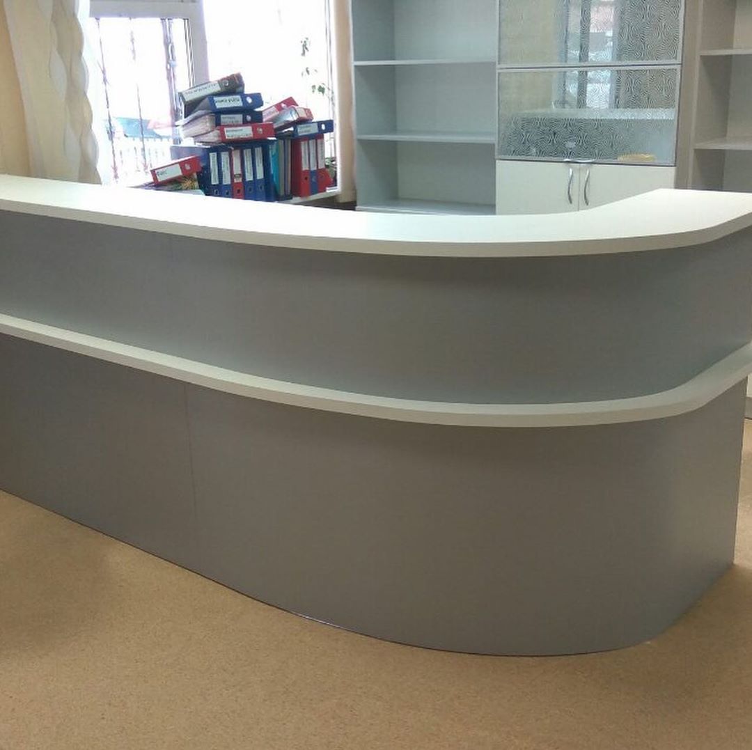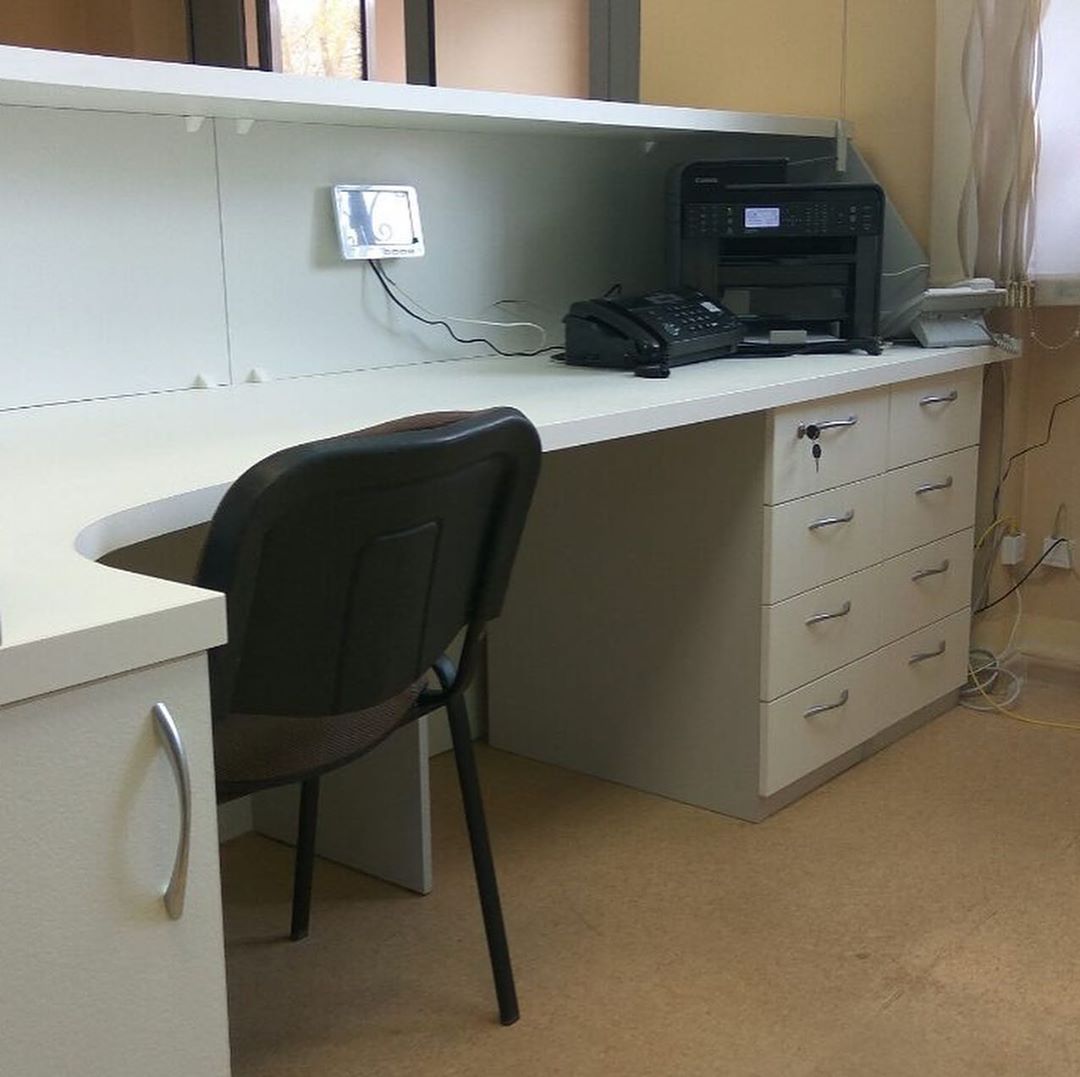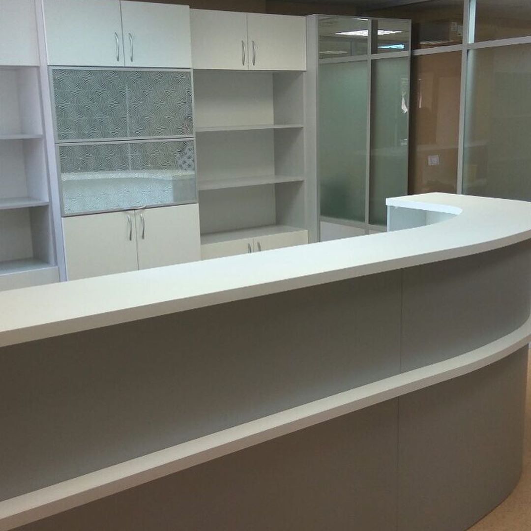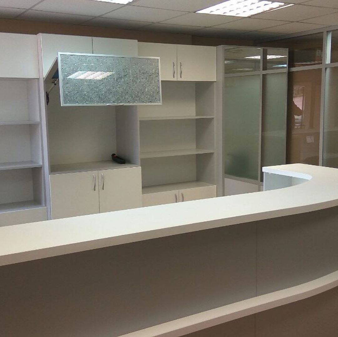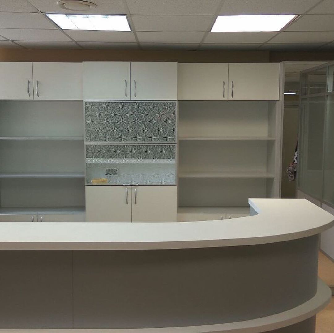 Функциональный набор мебели для офиса. Открытые полки, выдвижные ящики, шкафчики.