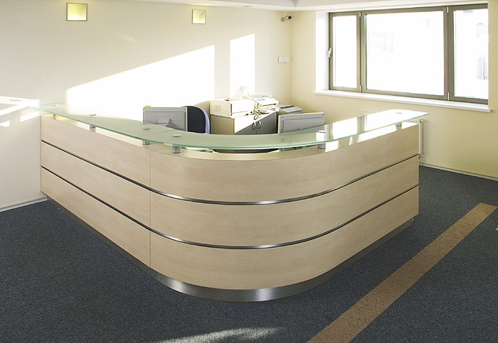 В гостевых помещениях компаний достаточно большое распространение получили угловые закругленные стойки ресепшн, которые позволяют с большим удобством расположить несколько сотрудников,организовать налаженную работу и выполнять качественную встречу гостей и клиентов. Данная модель зоны ресепшн прекрасно впишется в любую современную организацию с активной социальной позицией.