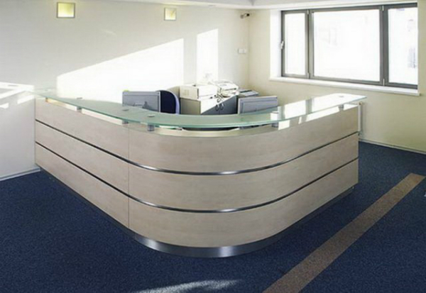 Угловая стойка-ресепшн впишется в любое помещение. Светлые фасады, металлические вставки, стеклянная столешница и радиусная форма – все это придаст стильный дизайн помещению.