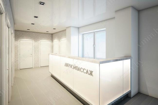 П-образная стойка рецепции изготовлена из современных и экологически чистых материалов в стиле минимализм. Светлая столешница под белый мрамор создает интересный ансамбль в сочетании с фасадом, выполненным из белого лакобеля с подсветкой. Такое сочетание создаст приятную и уютную атмосферу, а также привлечет много внимания.