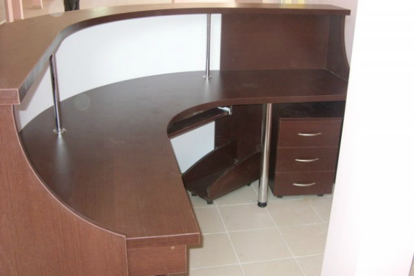 Данная модель стола-ресепшна станет не только местом для приема клиентов, но и комфортной рабочей зоной для сотрудника. Размеры столешницы позволяют установить компьютер, а для большого удобства предусмотрена выдвижная полка для клавиатуры и выдвижные ящики для хранения документов. Металлическая вставка смотрится стильно и современно.
