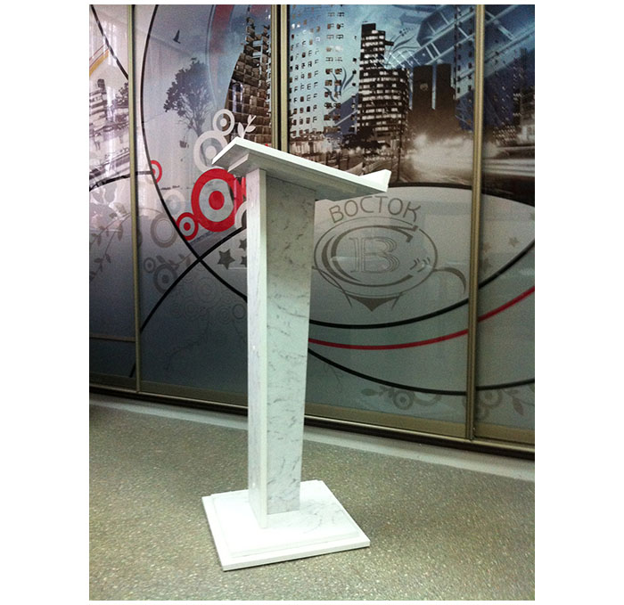 Изящная трибуна для выступлений изготавливается из пластика и декорирована специальными пластиковыми плитками квадратной формы, которые придают трибуне особую индивидуальность. Панель для документов, несмотря на компактность конструкции, широкая и удобная, что позволяет не беспокоиться о комфорте во время выступления.