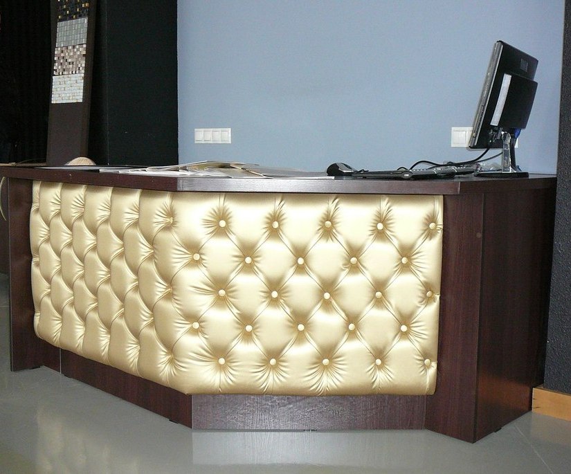 Невысокая угловая контактная стойка рецепции для общественных мест и приемных с диагональным углом, в корпусе под венге/темный орех с мягкой охристо-золотистой обивкой фасада в ромбической простежке с декоративными заклепками.