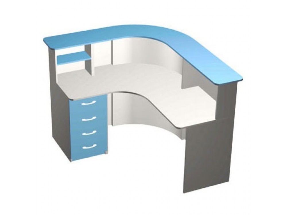 Стойка-ресепшн представляет собой угловой письменный стол с надстройкой. Столешница и фасады выполнены в голубом цвете. Для хранения документов предназначены открытые полки с нишами и тумба с выдвижными ящиками.