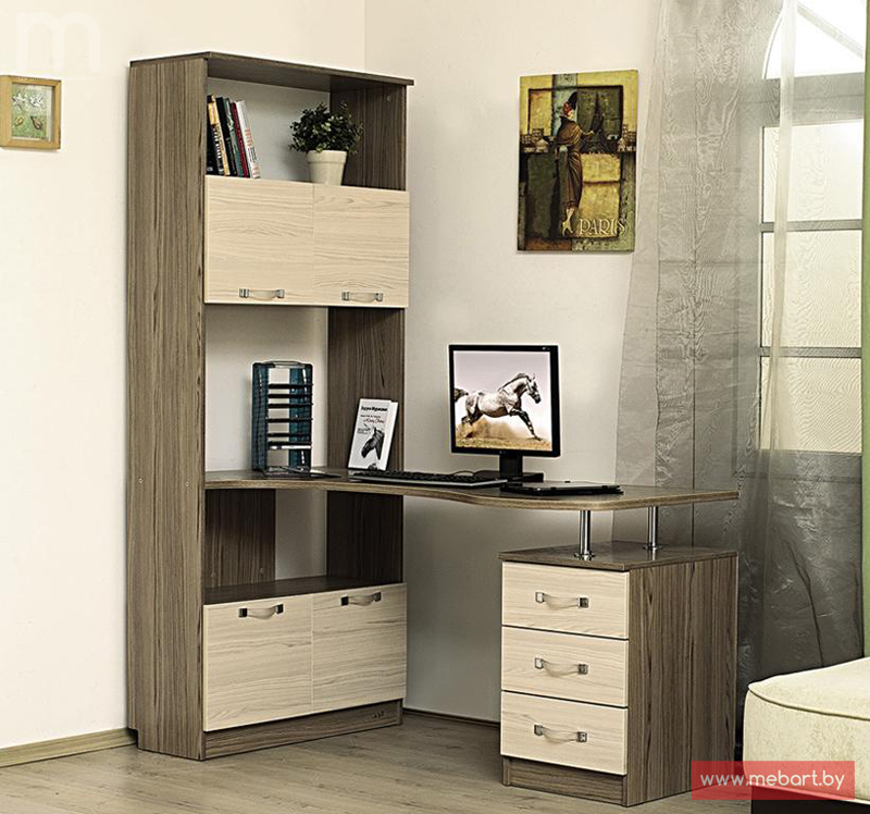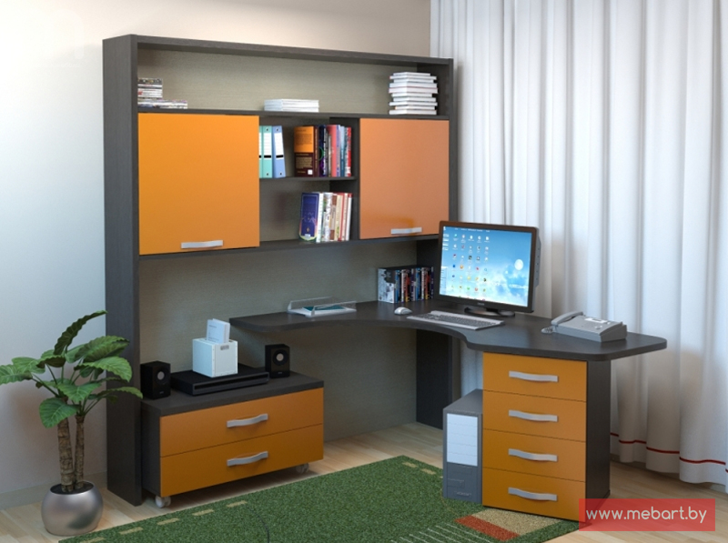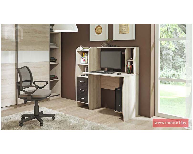 Компактный компьютерный стол будет отлично смотреться как в детской комнате, так и в рабочем кабинете. С одной стороны стол оснащен тумбочкой с двумя выдвижными ящиками. в комплекте имеется выдвижная полочка для клавиатуры.