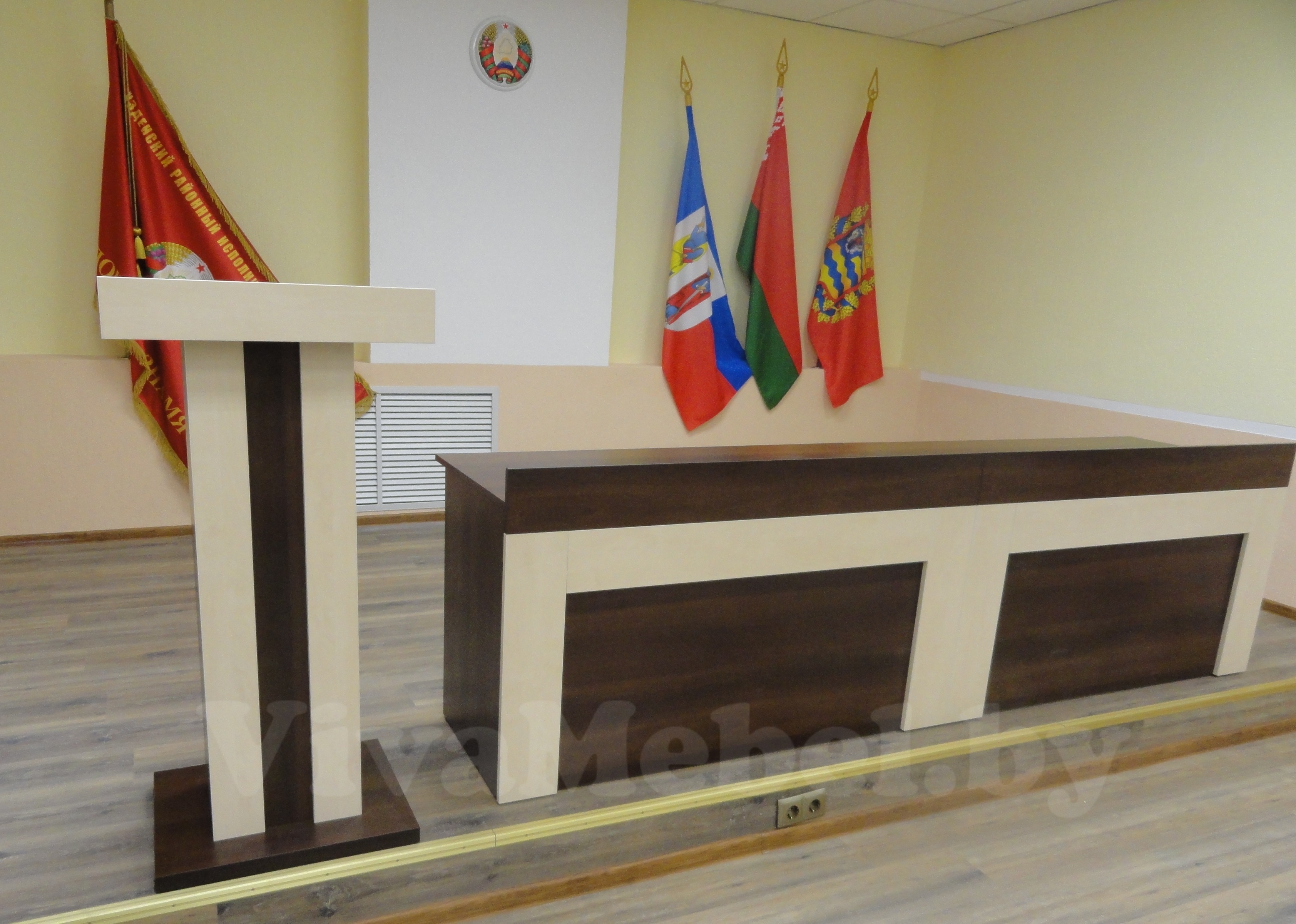 Большой стол для конференц зала представлен в современном стиле. Модель изготовлена из прочных и качественных материалов, гарантирующих долгий срок эксплуатации конструкции. В комплекте предлагается специальная трибуна, выполненная в одной цветовой гамме со столом.