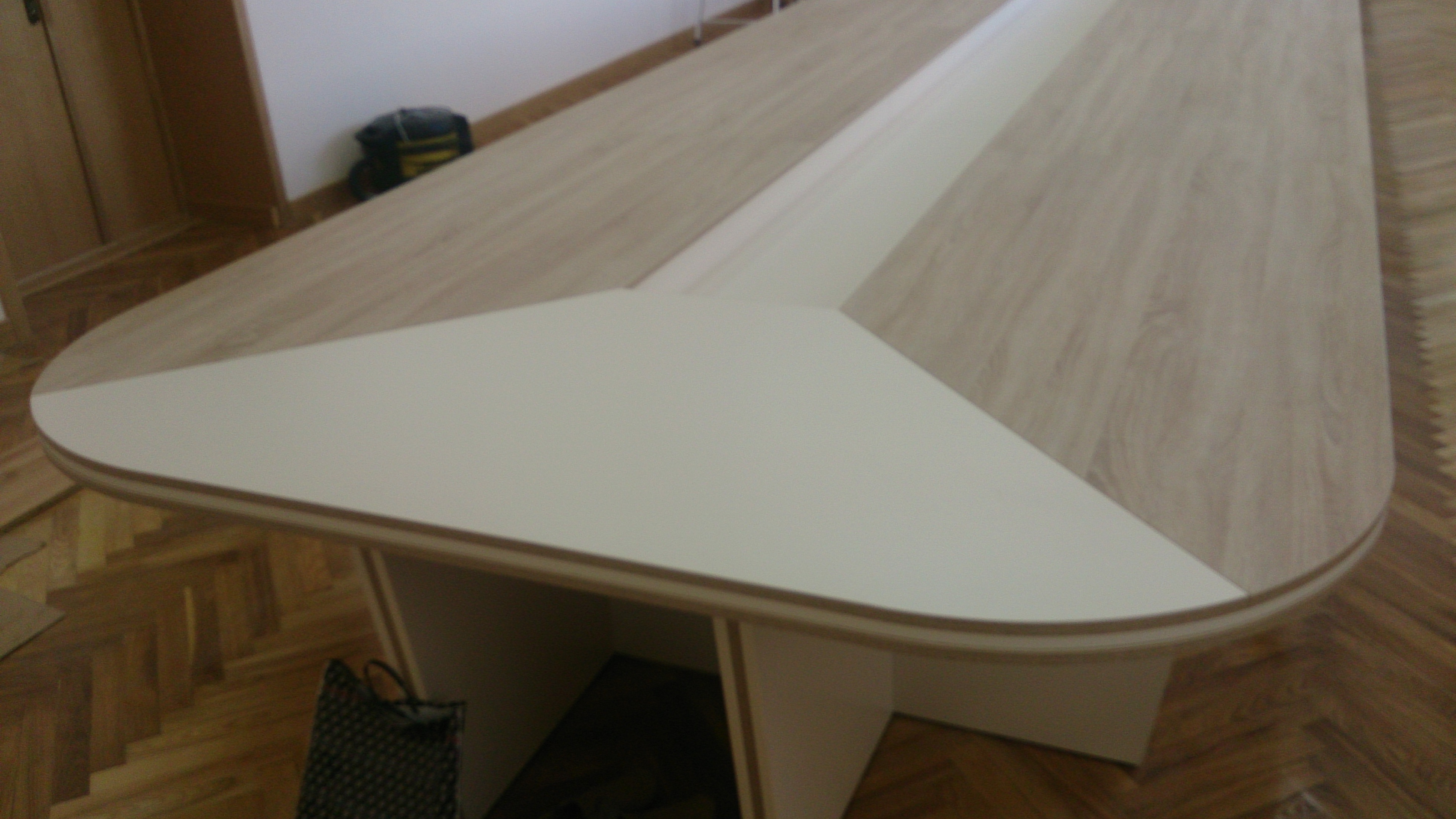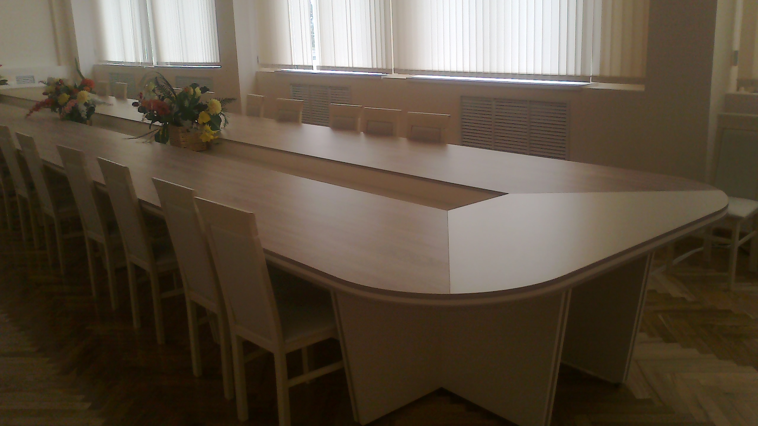 Длинный вместительный стол для плановых заседаний и рабочих конференций. Т-образная столешница выполенена под светлое дерево с белой трапецией вставки в овальном торце с закругленной кромкой, по центру расположена ниша для сопутствующего делового декора.