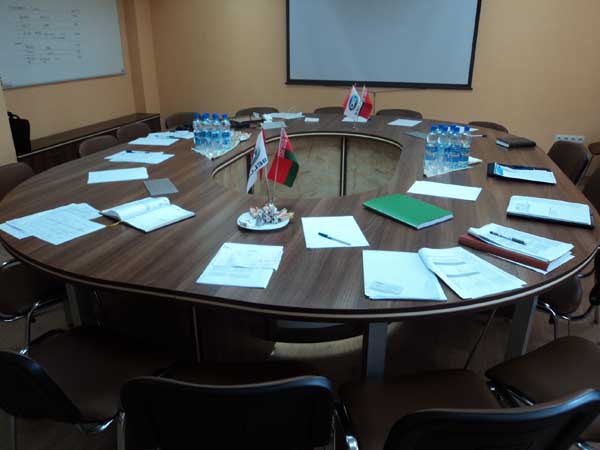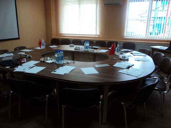 Круглый стол для комнаты совещаний в цвете орех. Стол рассчитан на размещение более 10 человек. В комплектацию входит небольшой чайный столик с радиусной формой фасадов, выполненный в общей дизайнерской концепции набора.