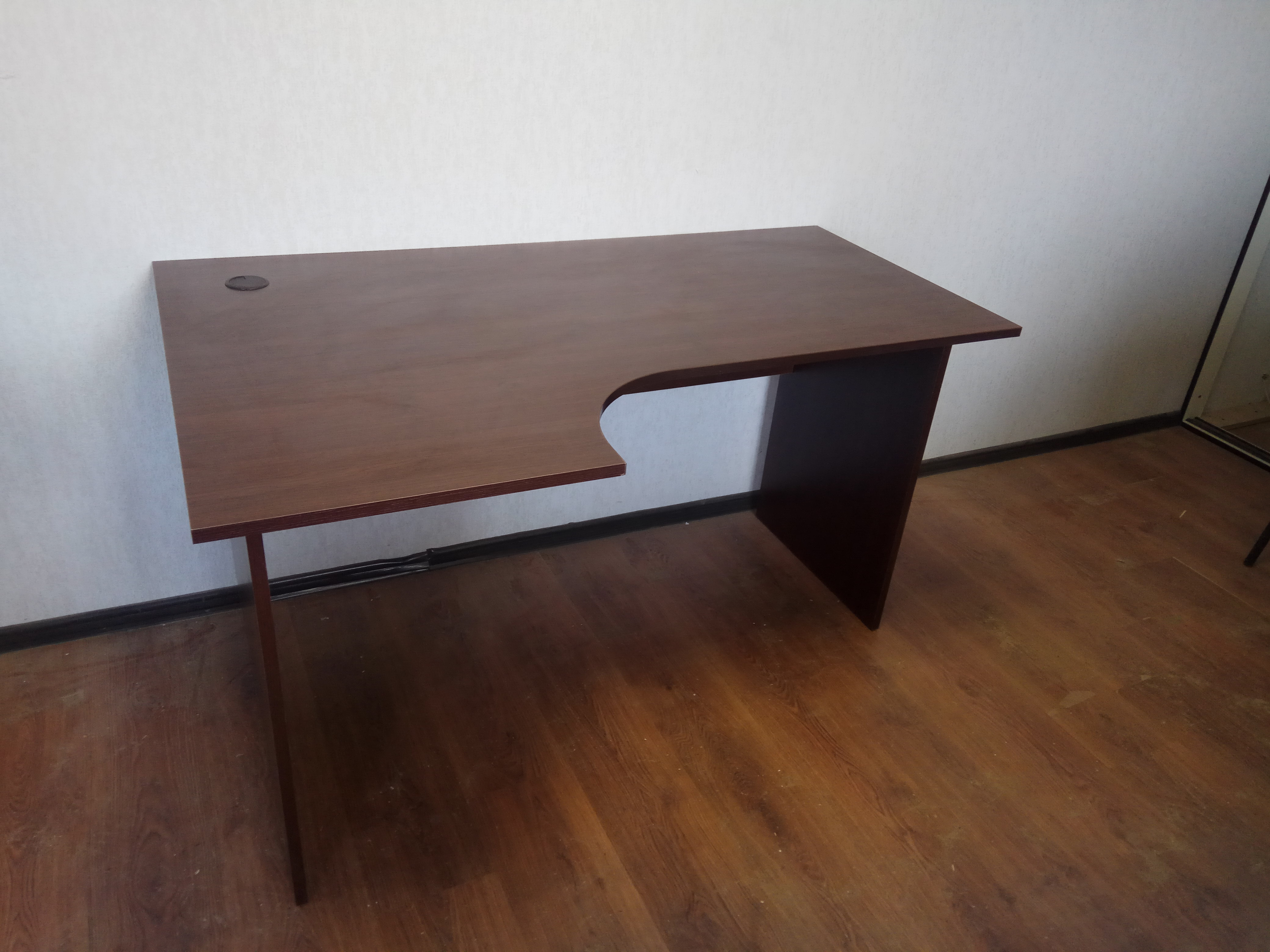 Стол офисный угловой из ламинированной ДСП с удобным открывающимся отверстием под провода. Возможно изготовление как право-, так и левосторонней модели.