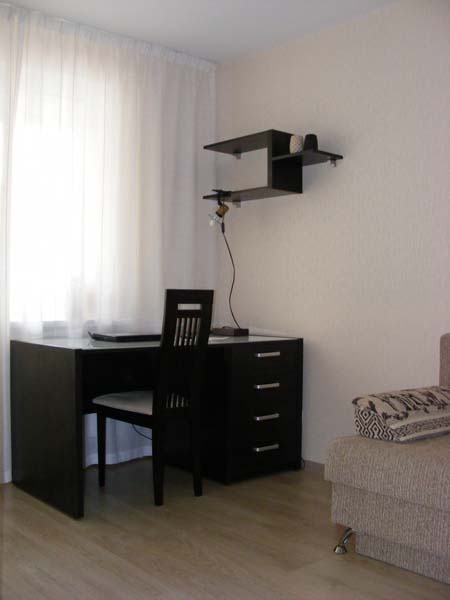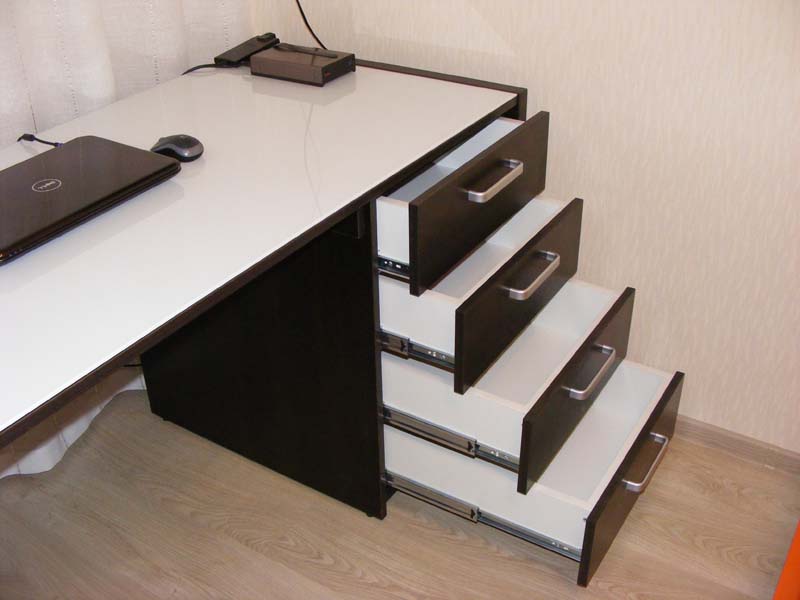 Стол выполнен в лаконичном современном стиле, без вычурных конструкторских решений, что, в принципе, не умаляет его функциональных достоинств. Столешница, в отличие от каркаса стола, выполнена в белом цвете, тогда как фасады основания и выдвижных ящиков изготовлены из ЛДСП стильного цвета дуба венге. Конструкция стола предусматривает наличие четырех выдвижных ящиков с металлической фурнитурой.