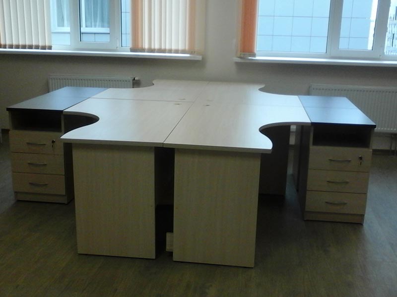 Этот мебельный гарнитур для офиса состоит из четырех комфортных столов. Каждое рабочее место оснащено тумбочкой с выдвижными ящиками для хранения бумаг. Широкая столешница позволит расположить на столе не только монитор, но и другую необходимую офисную технику (телефон, факс). Имеется также специальная ниша для системного блока.