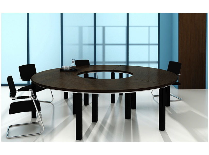 Стильный стол для переговоров отличается неординарностью формы и оригинальным дизайном круглого выреза в центре столешницы. Темные ножки отлично гармонируют с более светлым цветом столешницы. Нестандартность формы и изысканный современный дизайн поспособствуют созданию атмосферы размеренности и легкости в переговорах.