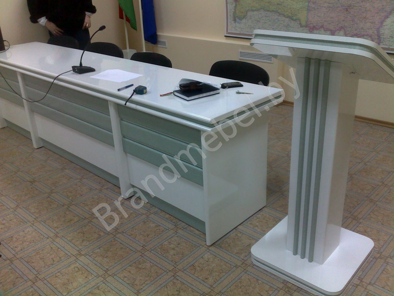 Элегантный длинный стол белого цвета с серыми вставками — идеальный выбор для официальных мероприятий. Благодаря своему дизайну, он прекрасно подойдёт для заседаний комиссии или жюри.
