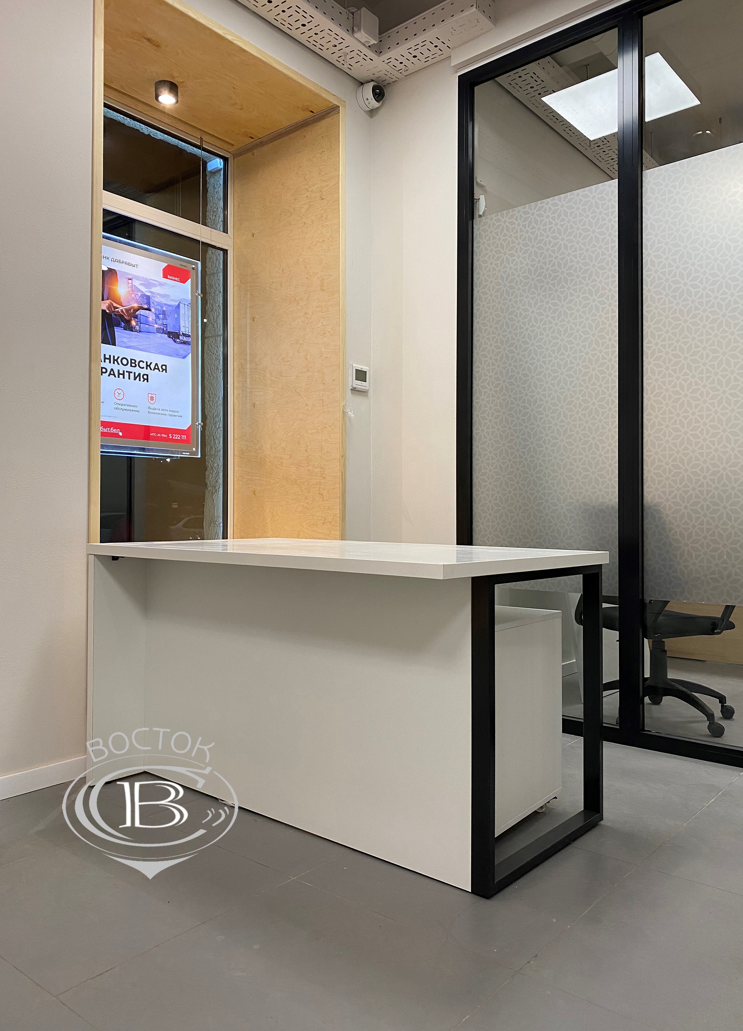 Стол для работы с посетителями с металлическим каркасом.