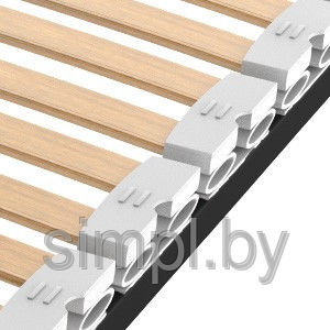 3 ― Латодержатели. Латодержатели-амортизаторы из стойкого к нагрузкам каучука. Придают ламелям две степени свободы, позволяя работать в двух плоскостях — смещаться в вертикальной плоскости и поворачиваться относительно горизонтальной оси. 4 ― Ламели. Гибкие и прочные ламели из однонаправленной березовой фанеры. Шаг ламелей (мм) ― 25, Ширина ламели (мм) ― 38, Подъемный механизм ― нет.