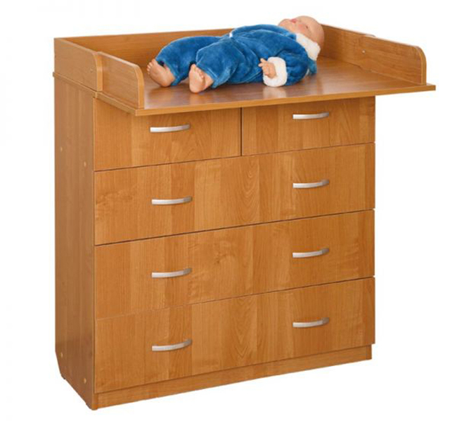 Представленный комод имеет откидную крышку, которая в разложенном положении представляет собой широкую полку. Верхняя часть комода также оснащена высокими бортиками, что обеспечивает необходимую безопасность даже самому подвижному младенцу. Основание комода позволяет ставить его вплотную к стене с плинтусом, что обеспечивает дополнительную устойчивость.