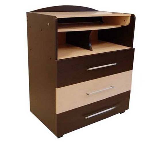 Комод выполнен в двухцветном оформлении, сочетая в себе фасады бежевого и цвета какао. Верх комода комплектуется полкой открытого типа, разделенной на две секции.