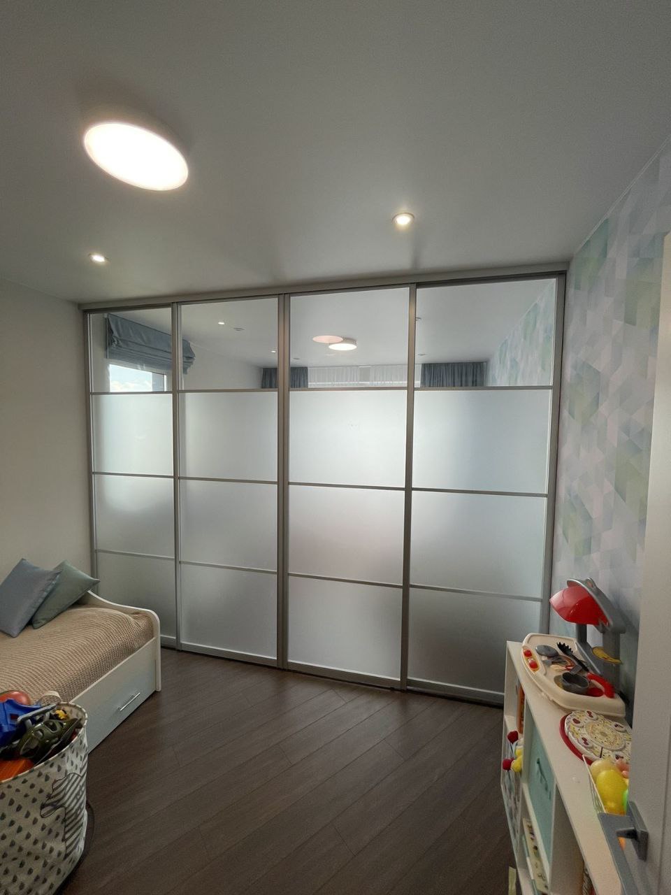 Подойдет для зонирования пространства в гостиной, спальне, гардеробной или даже кухни. Перегородка представляет собой полотно из профиля, который может быть наполнен стеклом, пластиком, акрилом или их комбинациями. Раздвижной механизм позволяет перемещать створки вдоль направляющих в одну или обе стороны.