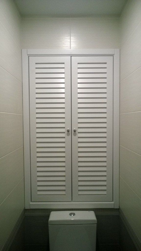 Эмалированные в белый цвет жалюзийные дверцы из массива, маскирующие нишу с водопроводными трубами, стояком и сантехническими приборами. Створки с миниатюрными ручками-кнопками.