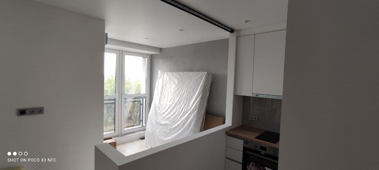 Перегородка в виде окна, угловая Г-образная, установлена между кухней и спальным местом.
