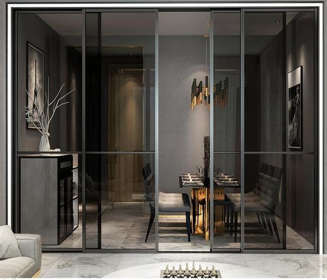 Перегородка из алюминия и прозрачного стекла разделяет кухню и гостиную.