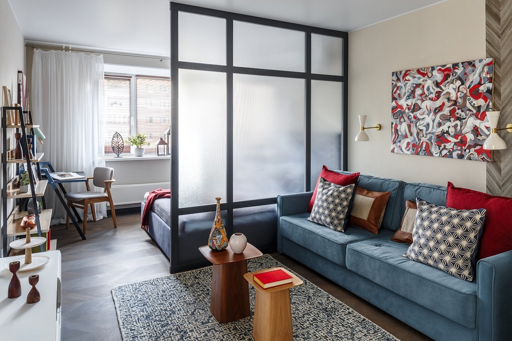Перегородка разделяющая пространство на кухню и спальню
