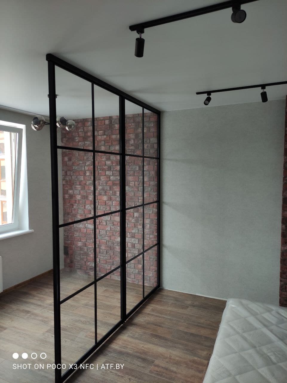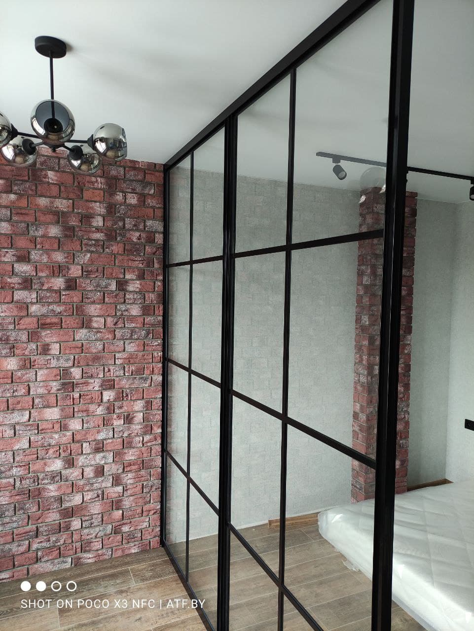Каскадная перегородка с матовым стеклом, установлена вместо межкомнатных дверей.