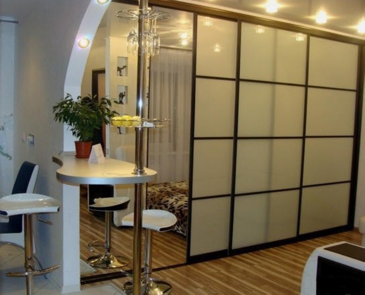 Перегородка с зеркальным стеклом, при разном освещении меняет свой цвет и становится почти непрозрачной.