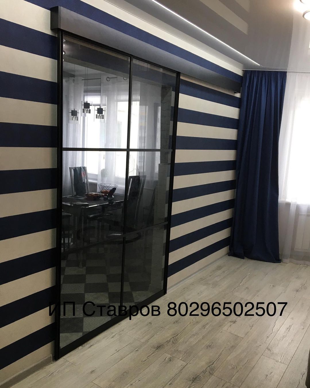 Напольная перегородка квартиру между кухней и залом, стекло с зеркальным эффектом
