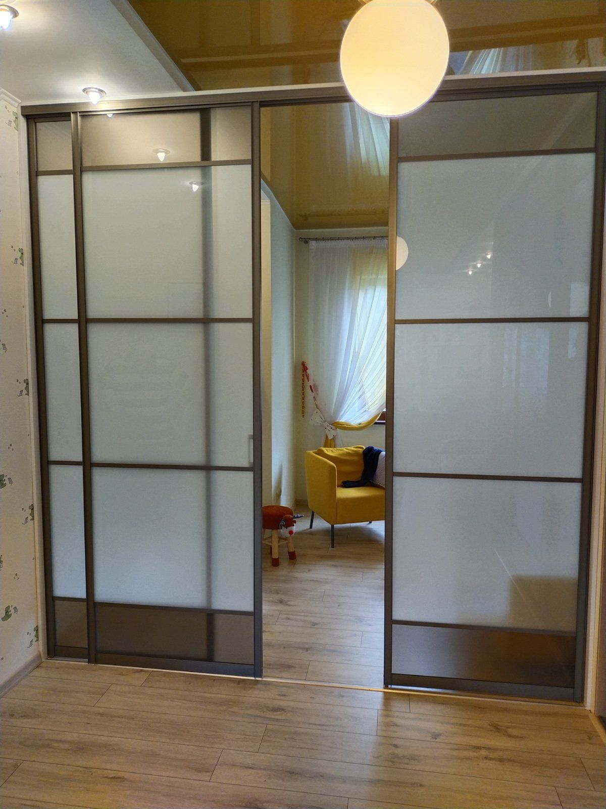Подойдет для зонирования пространства в гостиной, спальне, гардеробной или даже кухни. Перегородка представляет собой полотно из профиля, который может быть наполнен стеклом, пластиком, акрилом или их комбинациями. Развиджной механизм позволяет перемещать створки вдоль направляющих в одну или обе стороны.