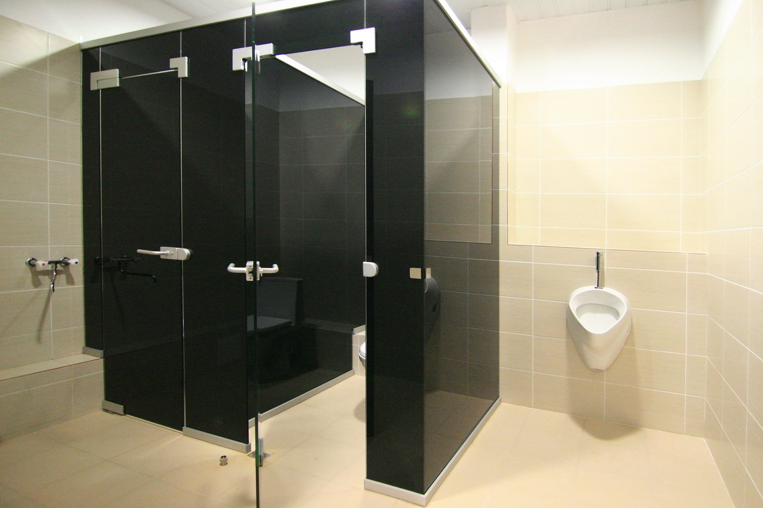 Раздвижная перегородка из прозрачного стекла на направляющих.