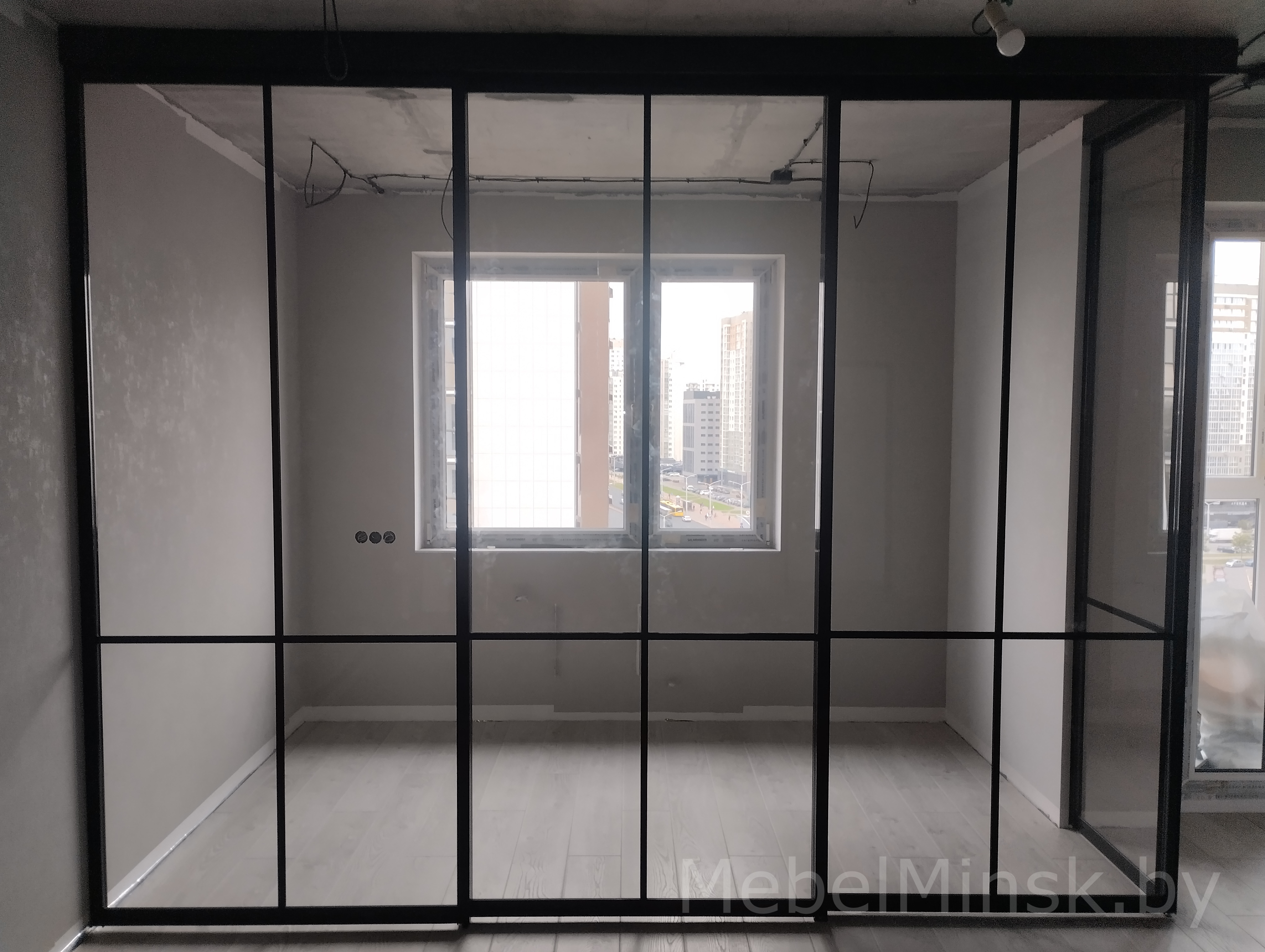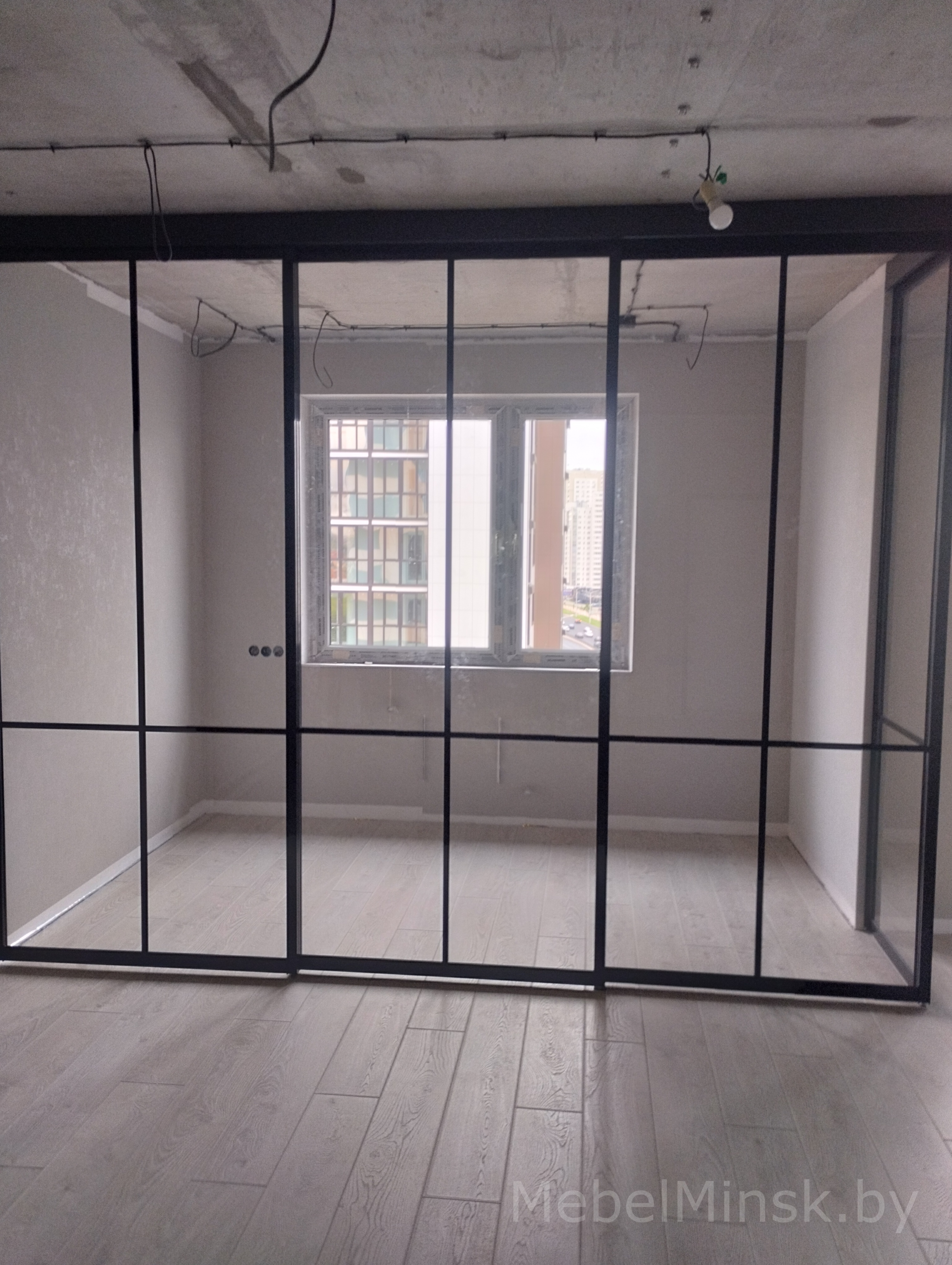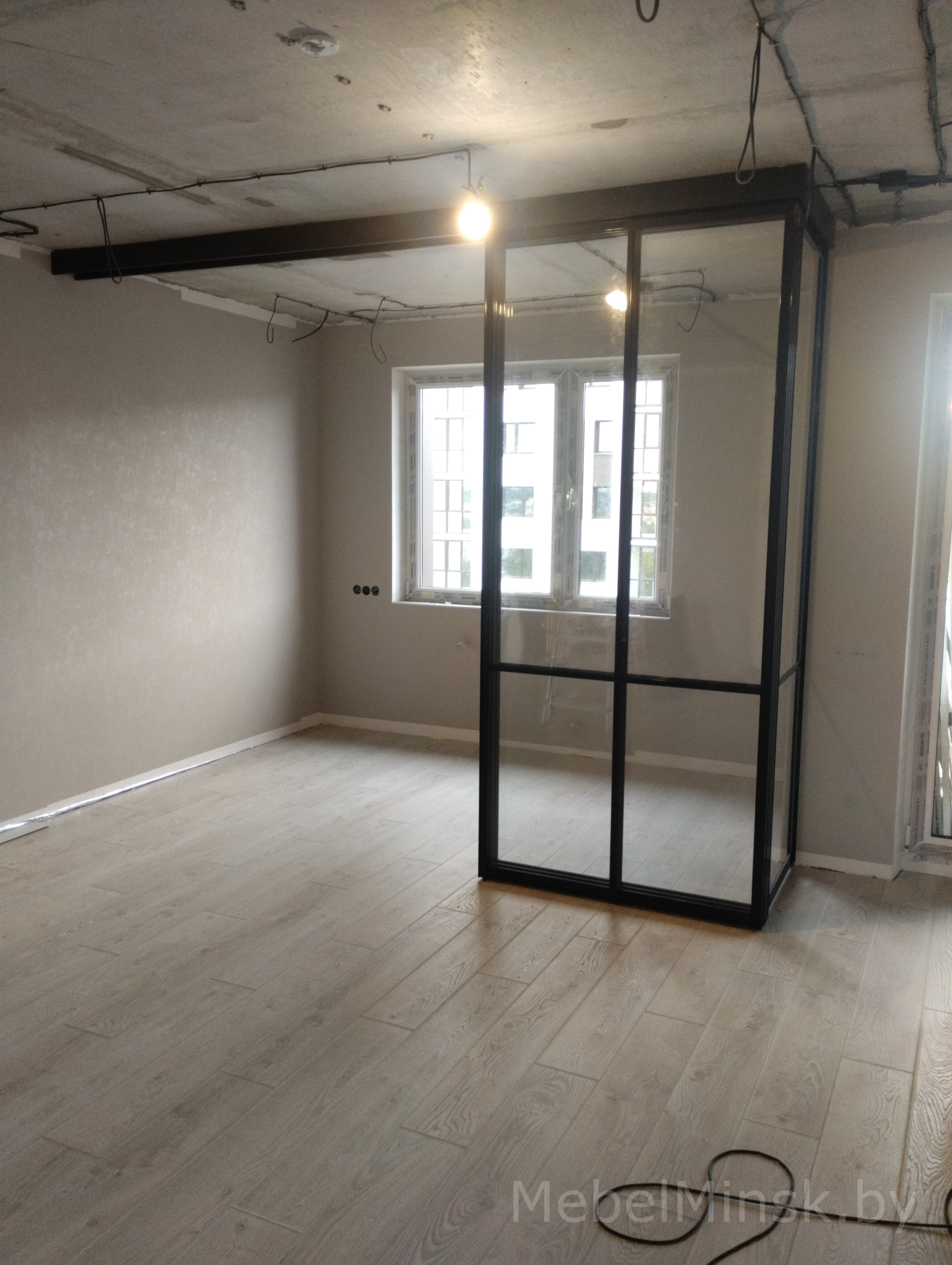 Перегородка на направляющих. Материал: непрозрачное стекло-лакомат.