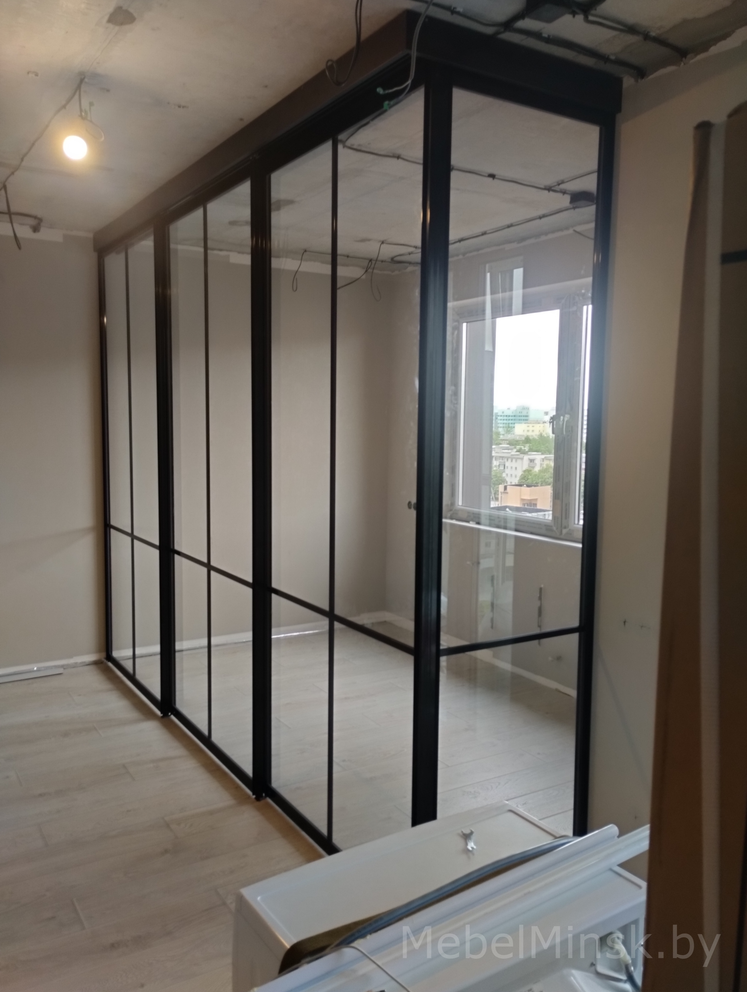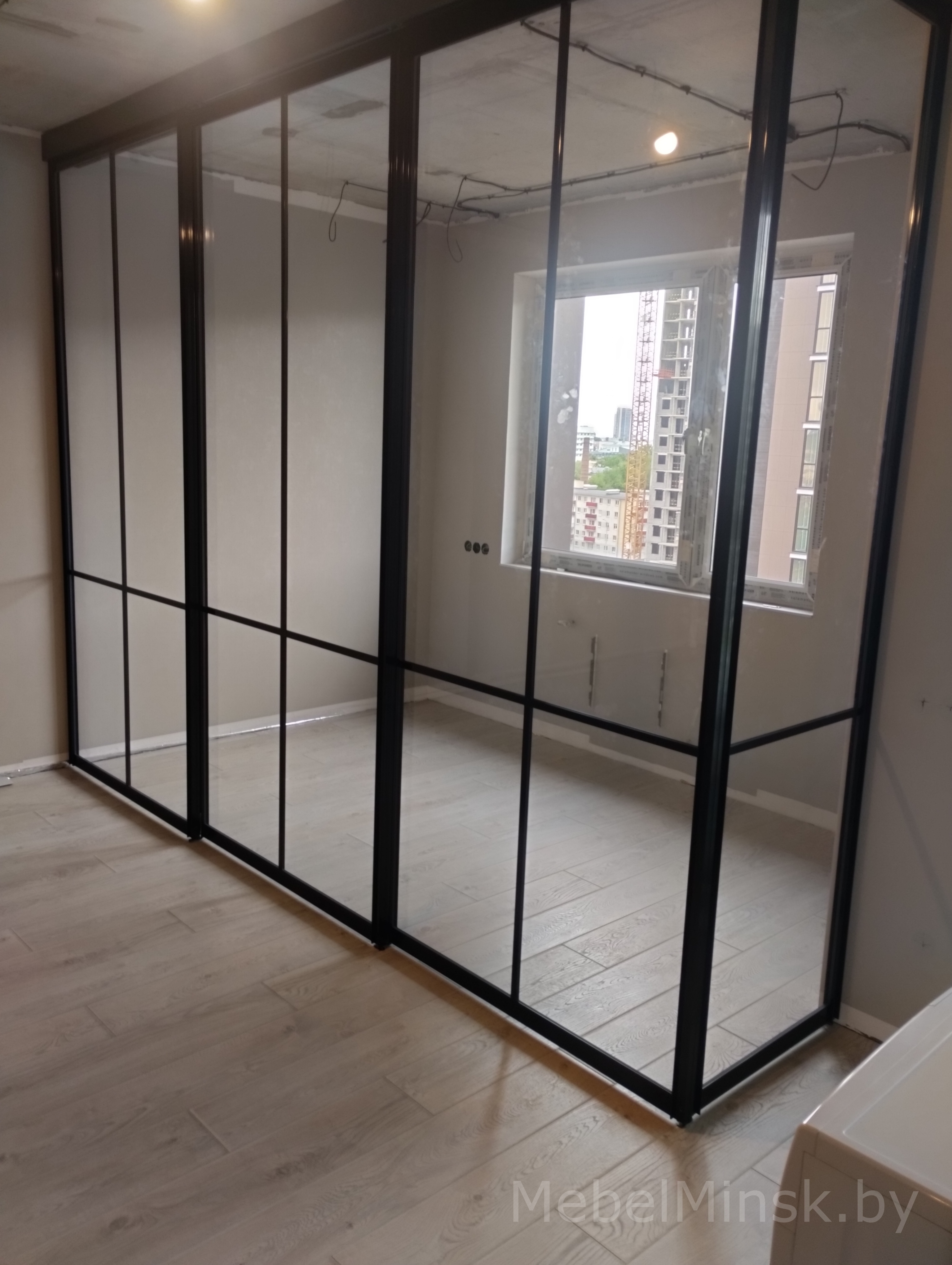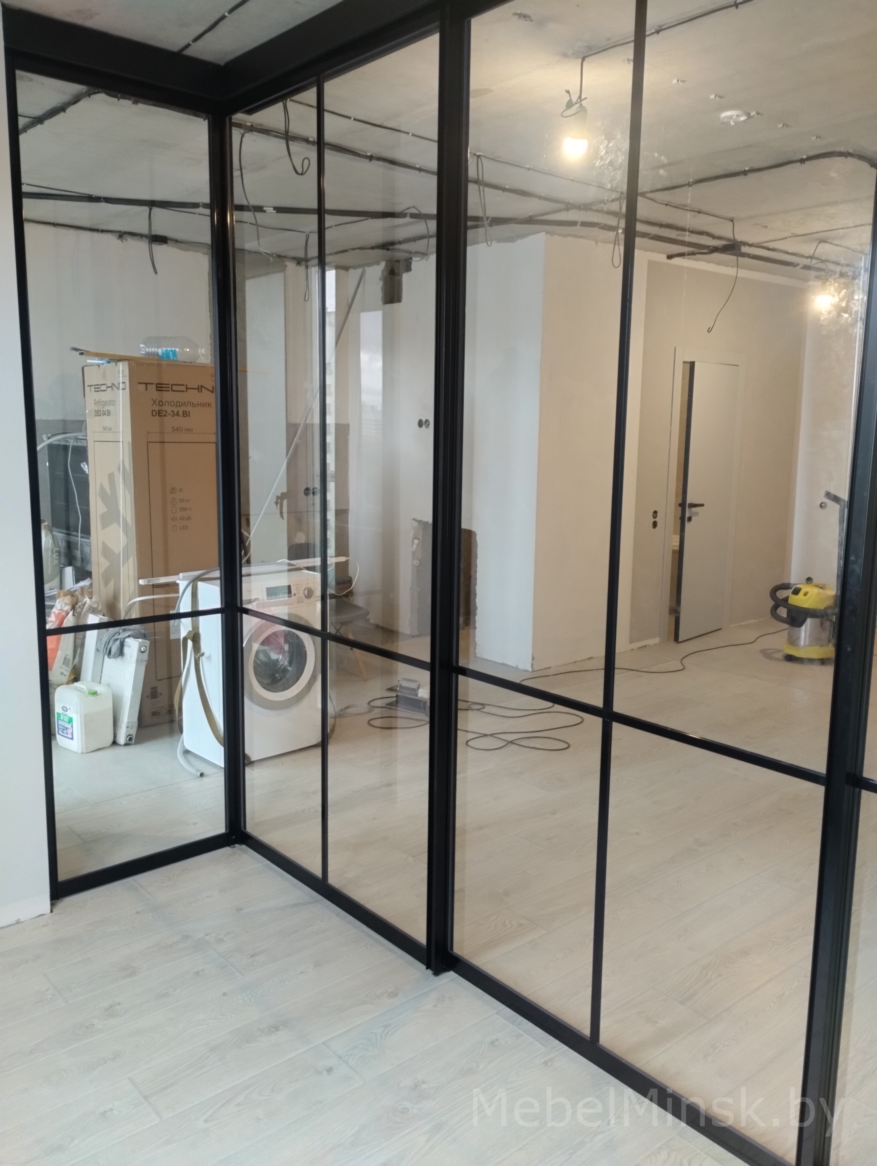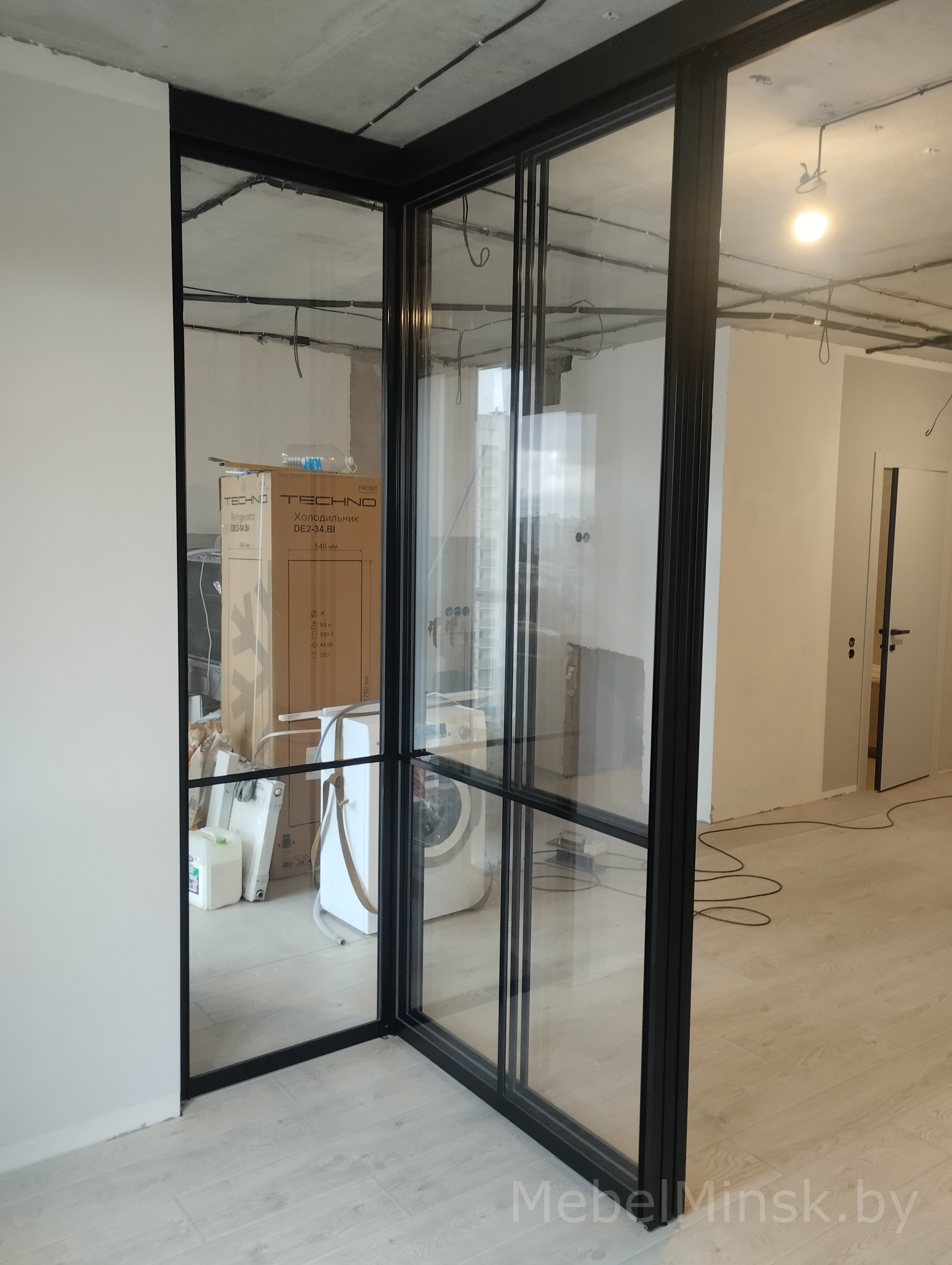 Перегородка на направляющих. Материал: непрозрачное стекло-лакомат.