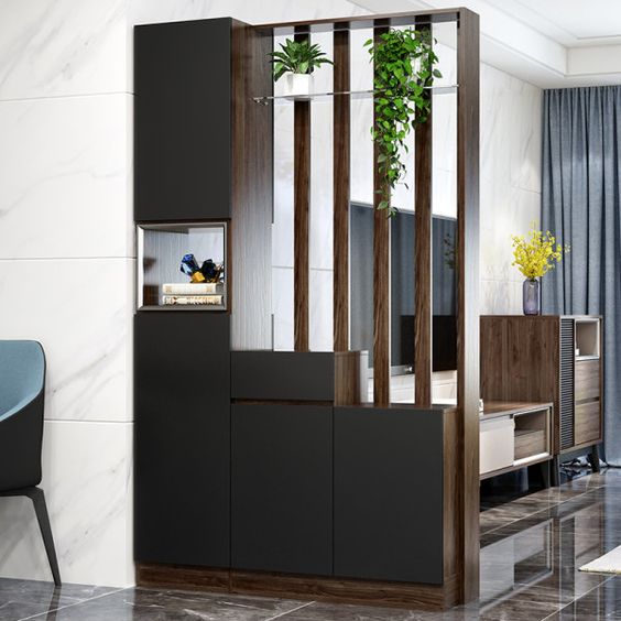 код 112050Функциональная перегородка с матовыми фасадами. Шкафчики, открытые полки.