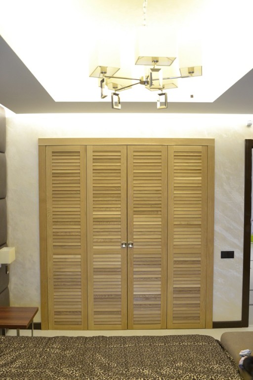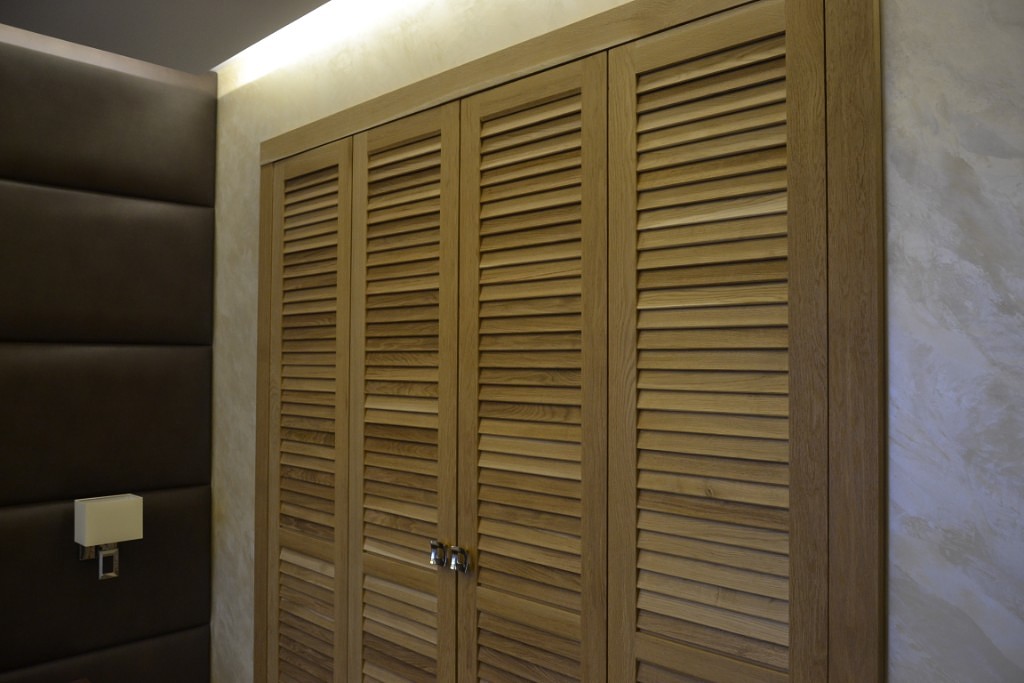 Складные ставни с жалюзийными дверцами из натурального массива в естественной расцветке. Квадратные металлические хромированные ручки.