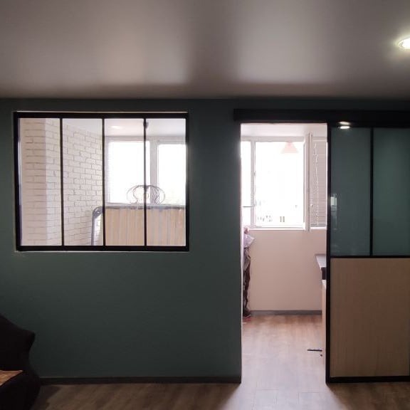 Подвесная перегородка со стеклом мателак, каскадная, состоит из 3ех секций,1 неподвижная 2 подвижные.