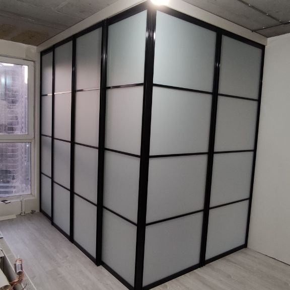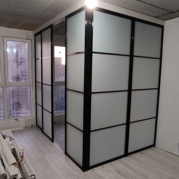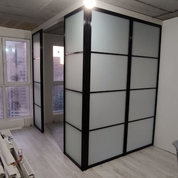 Раздвижная перегородка из прозрачного стекла на направляющих.