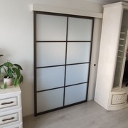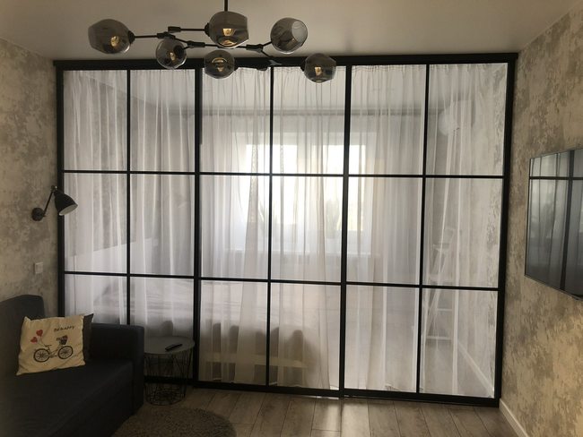 Подойдет для зонирования пространства в гостиной, спальне, гардеробной или даже кухни. Перегородка представляет собой полотно из профиля, который может быть наполнен стеклом, пластиком, акрилом или их комбинациями. Раздвижной механизм позволяет перемещать створки вдоль направляющих в одну или обе стороны.