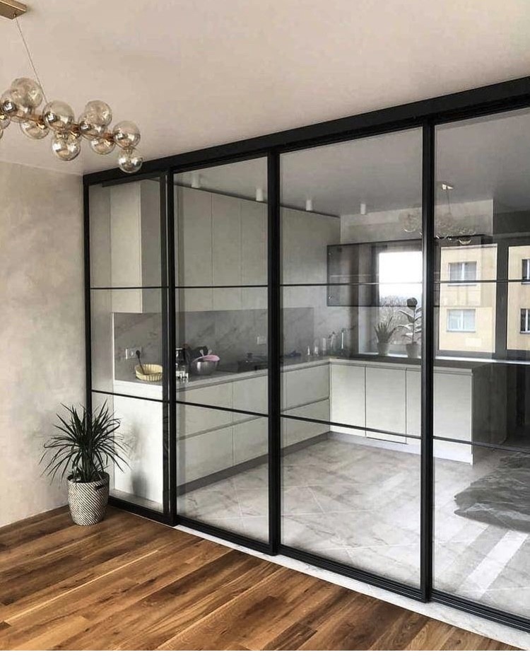 Отлично подойдет для правильного зонирования помещения. Матовое стекло.