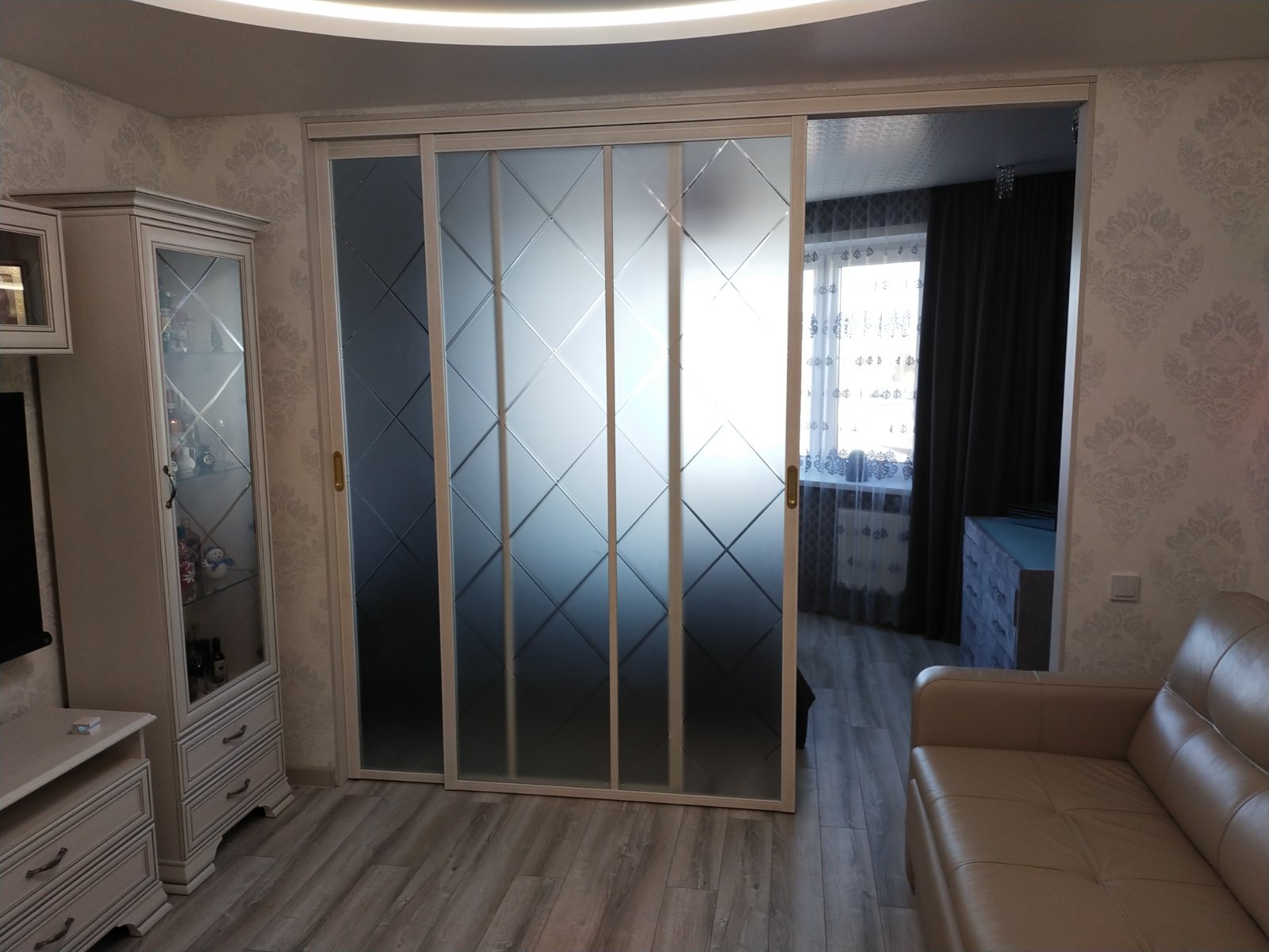 Раздвижная перегородка с гравировкой в гостиную