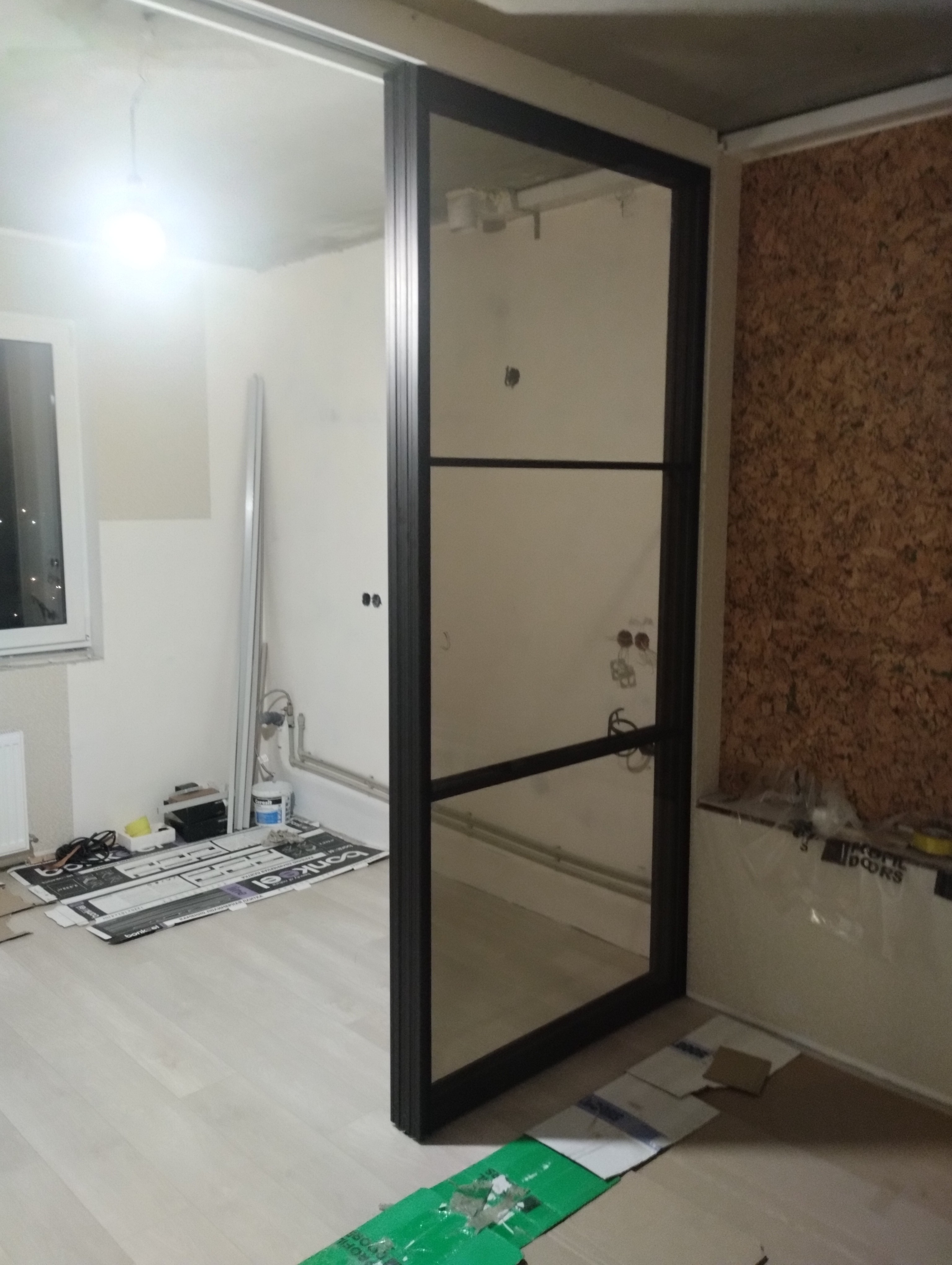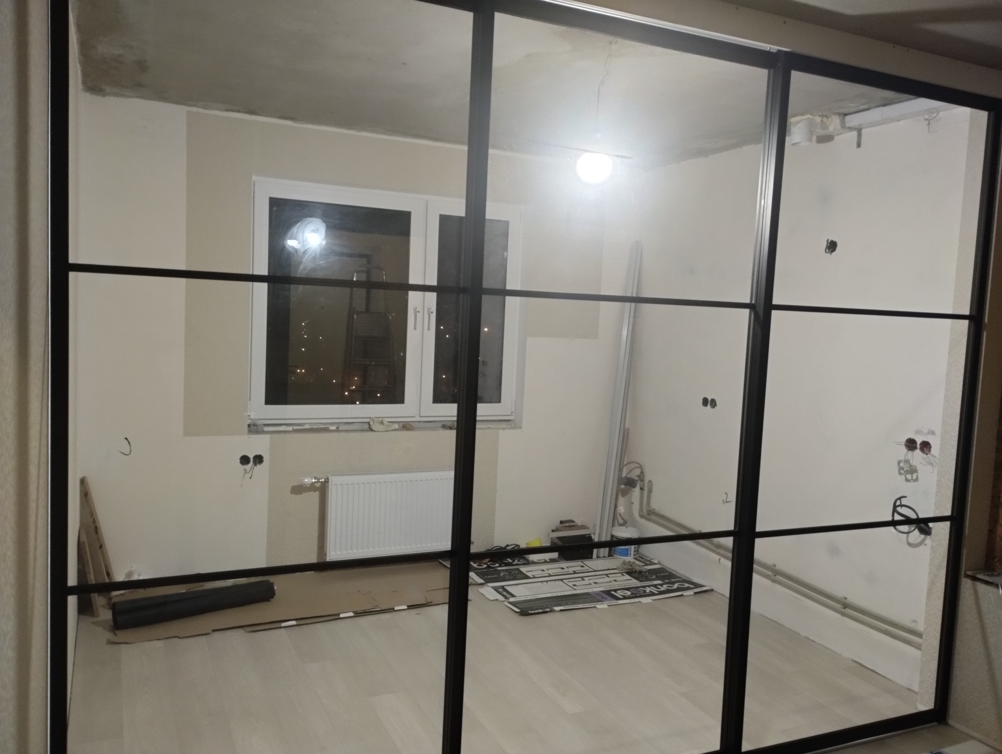 Каскадная перегородка с матовым стеклом и матовым черным профилем