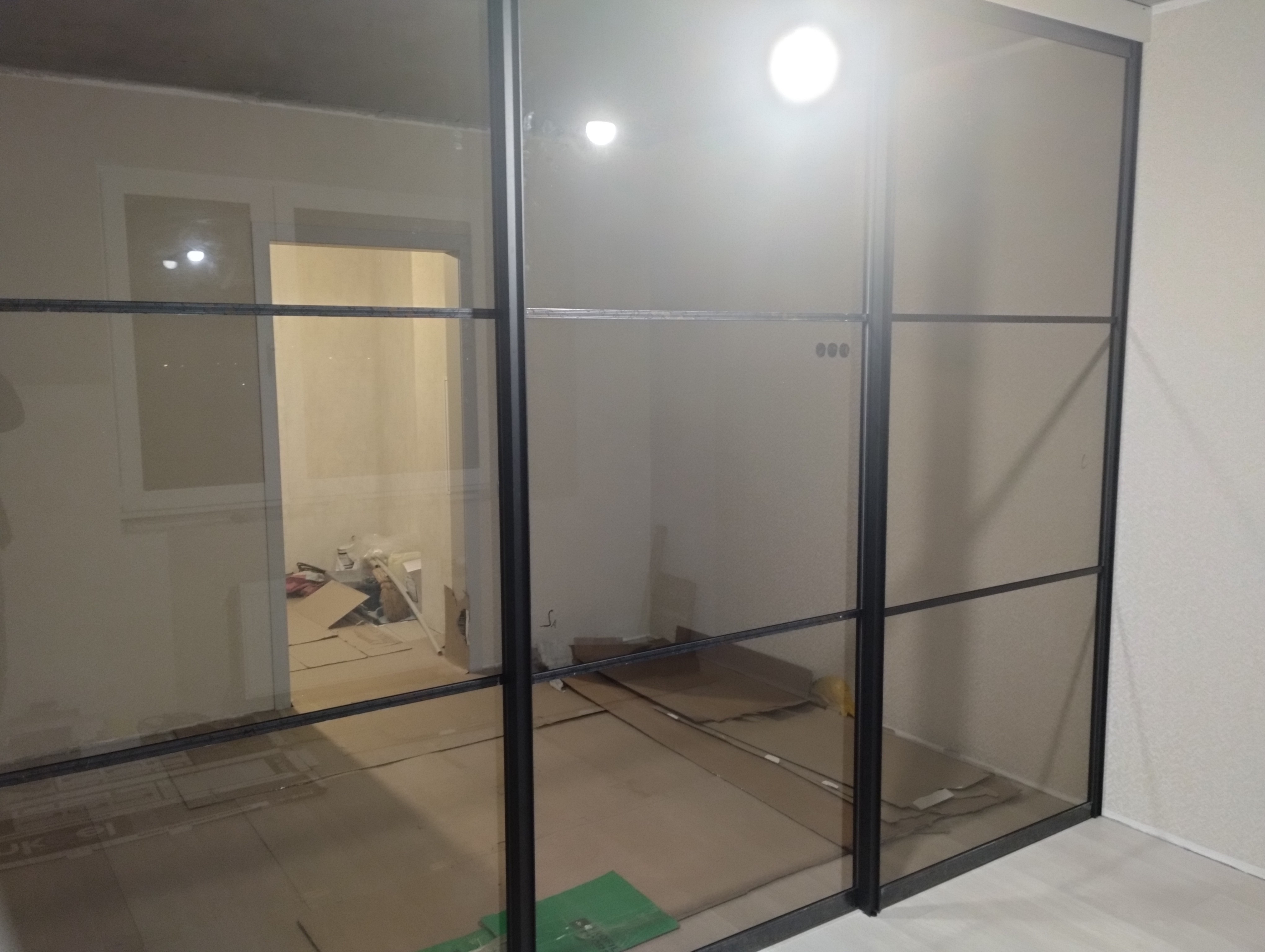 Стеклянная дверь-купе в черном профиле с доводчиком