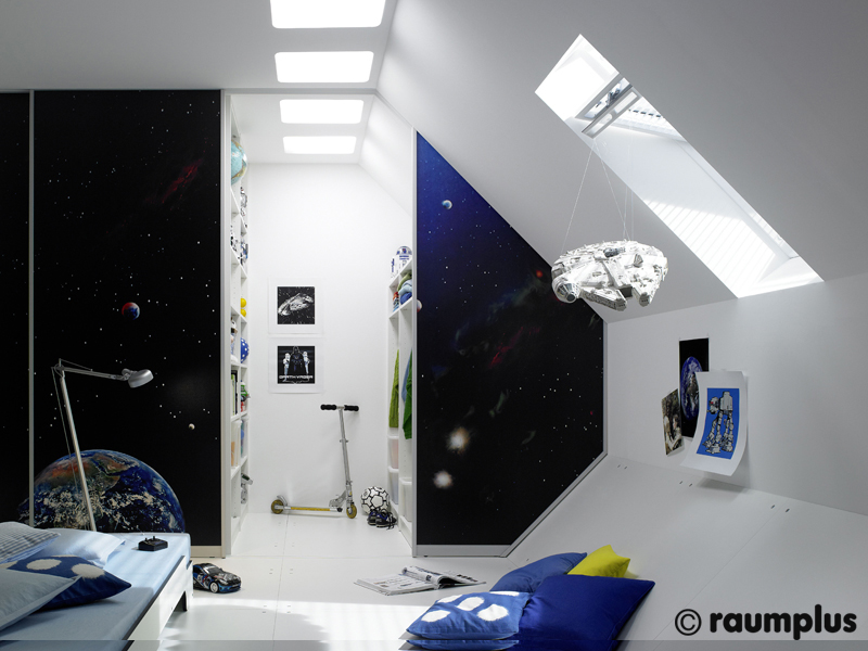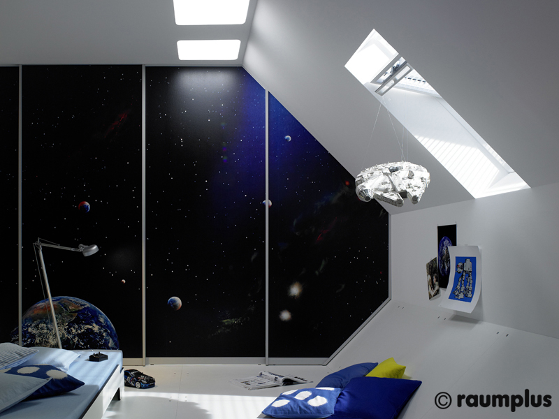 Для детской комнаты используется оригинальная модель раздвижных дверей. Секции данной конструкции декорированы реалистичными фотоизображениями космоса, которые в сочетании с соответсвующей отделкой стен производят очень яркой впечатление. Секции устанавливаются на специальную раму, которая крепятся в верхний части проема или на потолке. Открывание и закрывание дверей выполняется очень легко и плавно. Качественная фурнитура.
