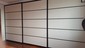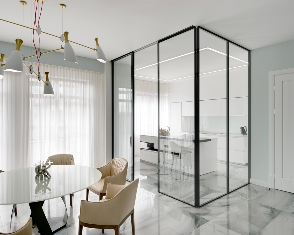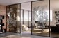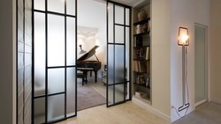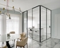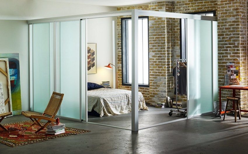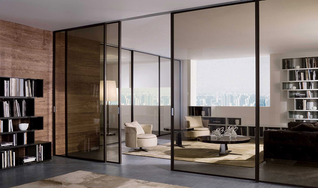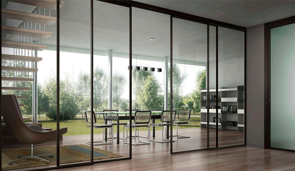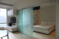 Раздвижная перегородка из прозрачного стекла на направляющих.