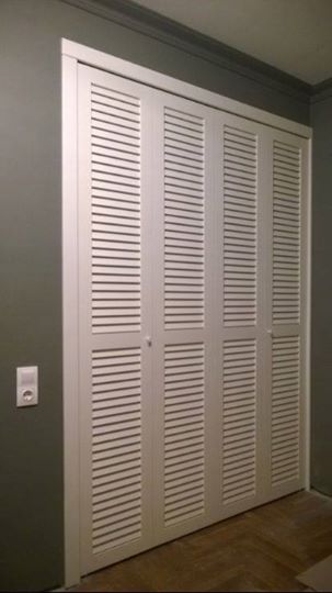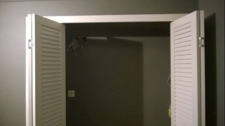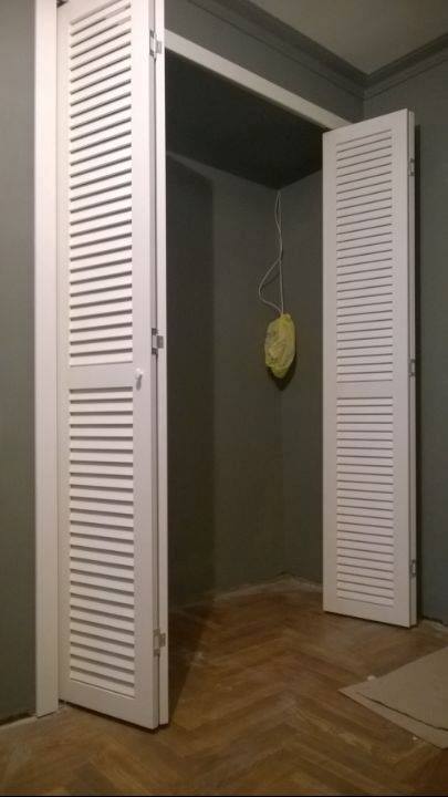 Две дверцы в четыре створки с миниатюрными круглыми ручками. Фасад жалюзи из натурального массива дерева эмалирован в белый цвет и способствует оптимальной вентилляции ниши для гардероба.